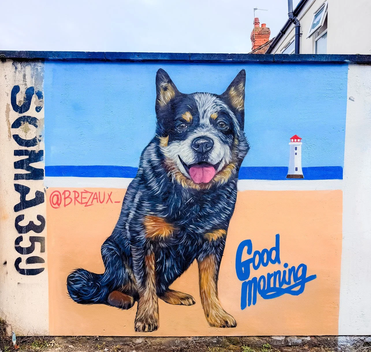 The mural is a community-led tribute, painted in New Brighton by local artist Brezaux. Over the course of painting, dog walkers and owners repeatedly stopped to watch, talk, and share memories. People told stories about Cain. They also told stories about their own dogs. The wall became a place where grief and affection turned into something shared and steady.
